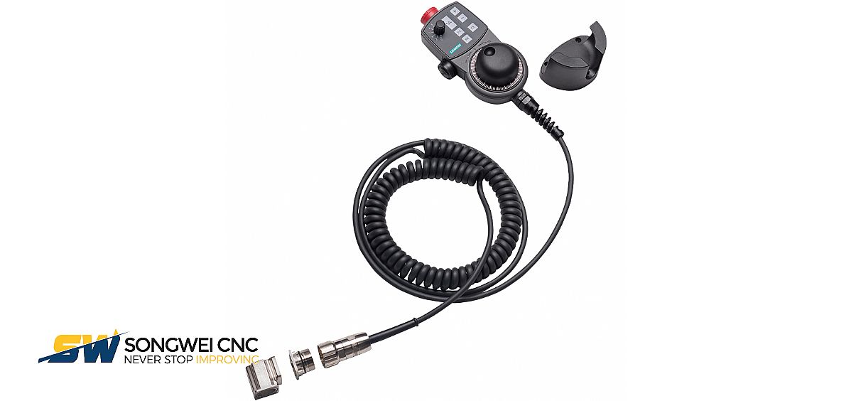 Product Description: mini handheld unit for SINUMERIK with straight cable length of 5 m 2-channel EMERGENCY STOP, 3-stage acknowledgment button with metal connection plug handwheel with magnetic latching